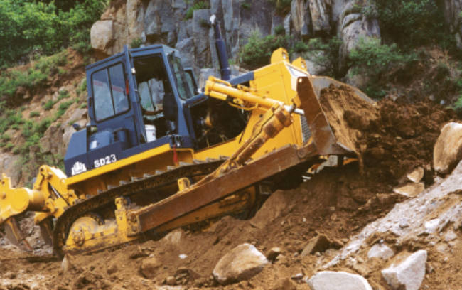 SD23推土機某山壩征戰(zhàn)作業(yè)。SD23推土機采用山推自制傳動系統(tǒng)和底盤系統(tǒng),配置重發(fā)/濰柴發(fā)動機,爬坡能力可達30°。由于超高的出勤率,超低的維護成本,贏得用戶充分認可。