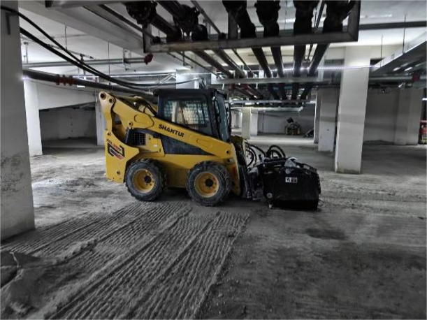 近日,在天津市河西區(qū)某高端住宅小區(qū)的地下車(chē)庫(kù)施工現(xiàn)場(chǎng),一臺(tái)山推SSL75V-M滑移裝載機(jī)正有條不紊地進(jìn)行地面銑刨拉毛作業(yè)。作為該項(xiàng)目地下車(chē)庫(kù)施工中的核心設(shè)備之一,SSL75V-M憑借其靈活機(jī)動(dòng)的作業(yè)能力、卓越的多功能屬具配置和高效穩(wěn)定的施工表現(xiàn),為客戶解決了效率低、空間受限等施工痛點(diǎn)。