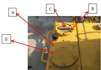 1、把推土鏟和松土器降到地面,使之停放牢靠,關(guān)閉發(fā)動(dòng)機(jī),并慢慢地轉(zhuǎn)動(dòng)加油口(A)的蓋以釋放內(nèi)部壓力。然后把蓋拆下。