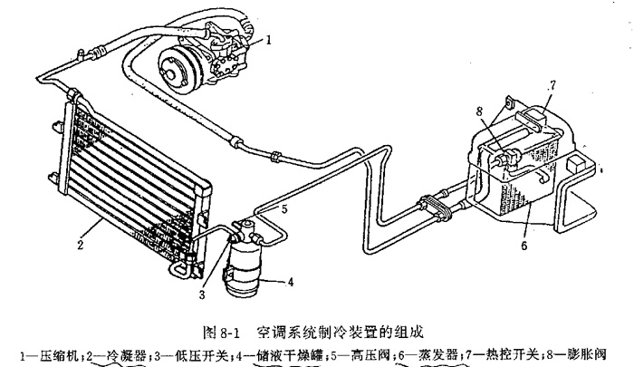 1-電磁離合器及壓縮機2-冷凝器3-低壓開關(guān)4-儲液干燥器5-高壓閥6-蒸發(fā)器7-熱控開關(guān)8-膨脹閥